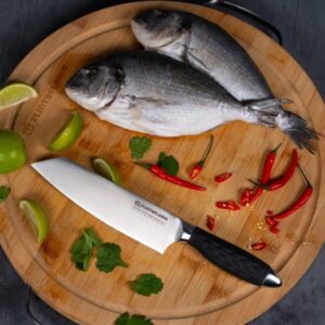 The Pro Series 6″ Deba knife features our distinctive high impact silicone handle for extra grip with a modern appearance. This knife is inspired by the Japenese Deba blade traditionally used for fish and poultry. The extended blade makes this a very versatile knife in the kitchen. This Flint & Flame knife arrives in our lockable blade cover.