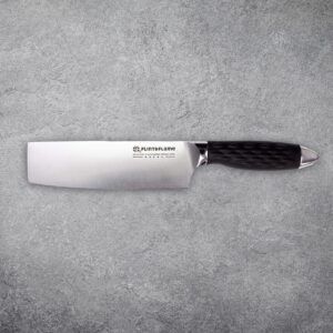 The Pro Series 6″ Nakiri Knife features our distinctive high impact silicone handle for extra grip with a modern appearance. It may look like a mini meat cleaver, but it’s so much more. The straight blade of the Nakiri allows you to cut all the way down to the chopping board, without the need for pulling or pushing. Its thin blade allows you to achieve a smooth, clean cut through any vegetable you like making it perfect for French cuts such as Julienne or Batonnet. This Flint & Flame knife arrives in our lockable blade cover.