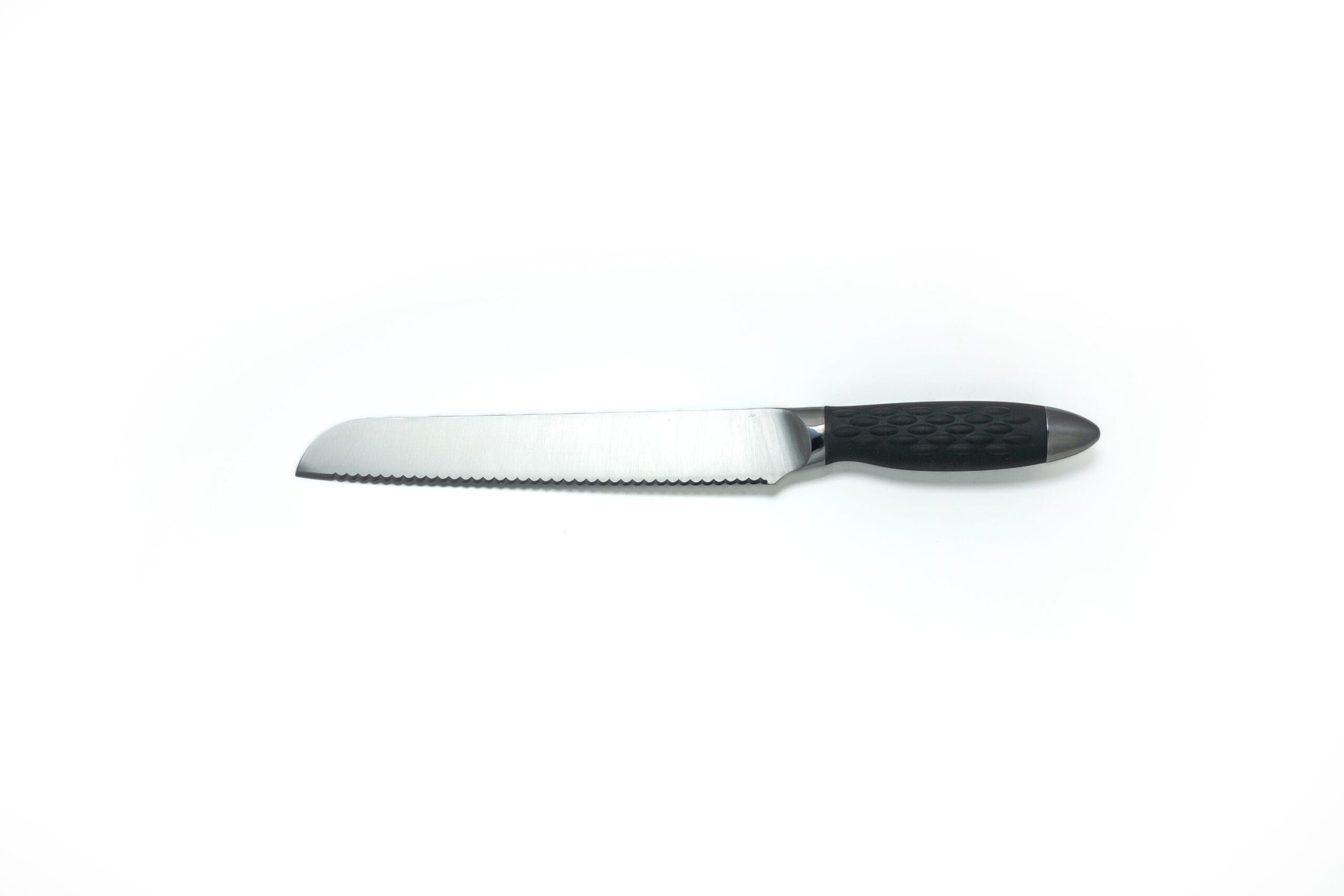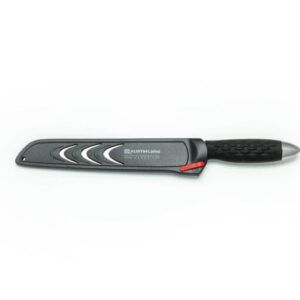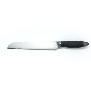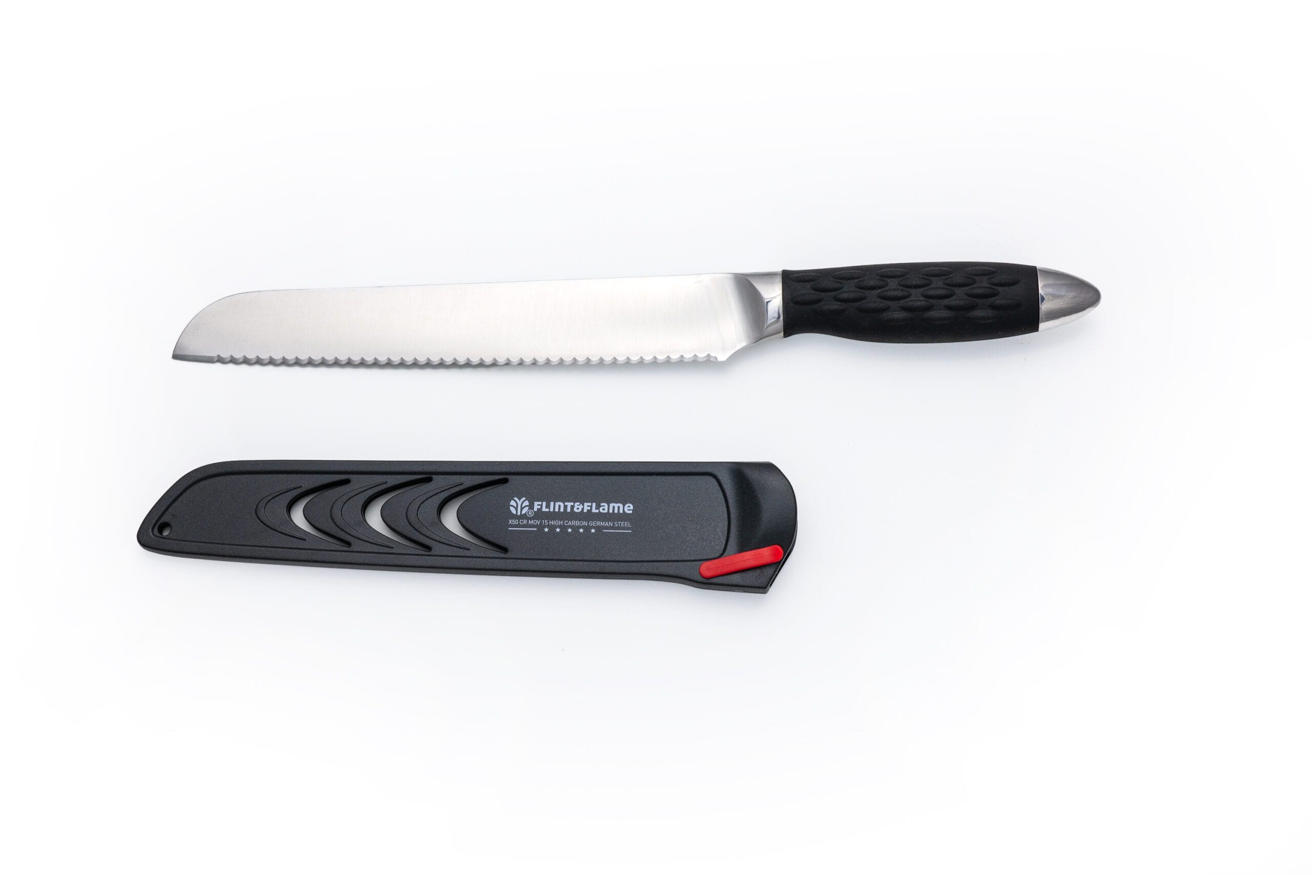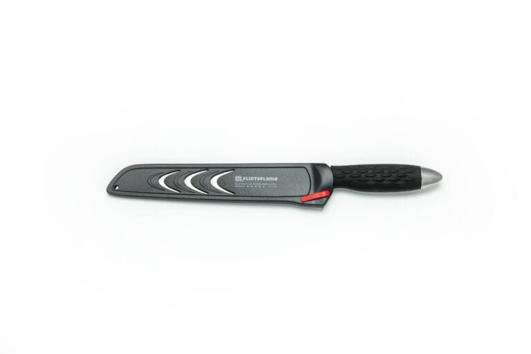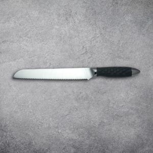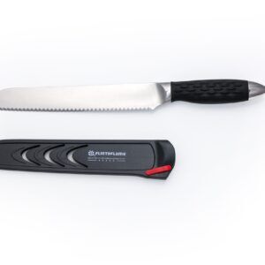 The 8″ Bread knife is designed with our double-sided scallop serration which makes for a perfect slice every time. This knife is not only fantastic on all types of bread, but also lettuce, larger vegetable and even baked goods. This Flint & Flame knife arrives in our lockable blade cover.