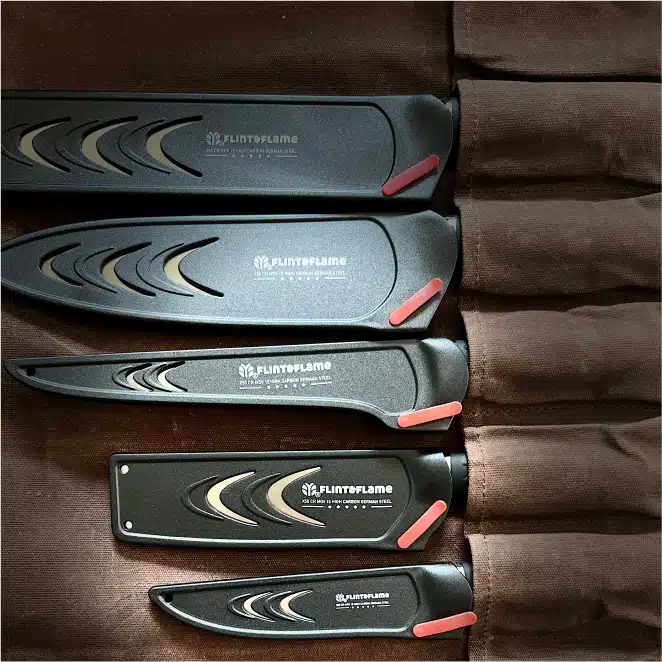 This essential collection includes 5 knives perfect for the hunt, camping or barbecue, all with lockable blade covers: